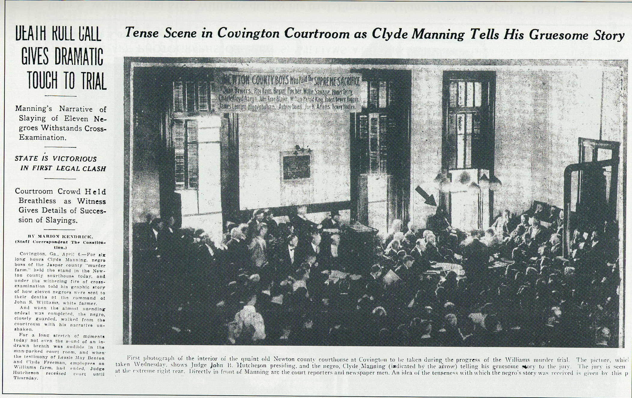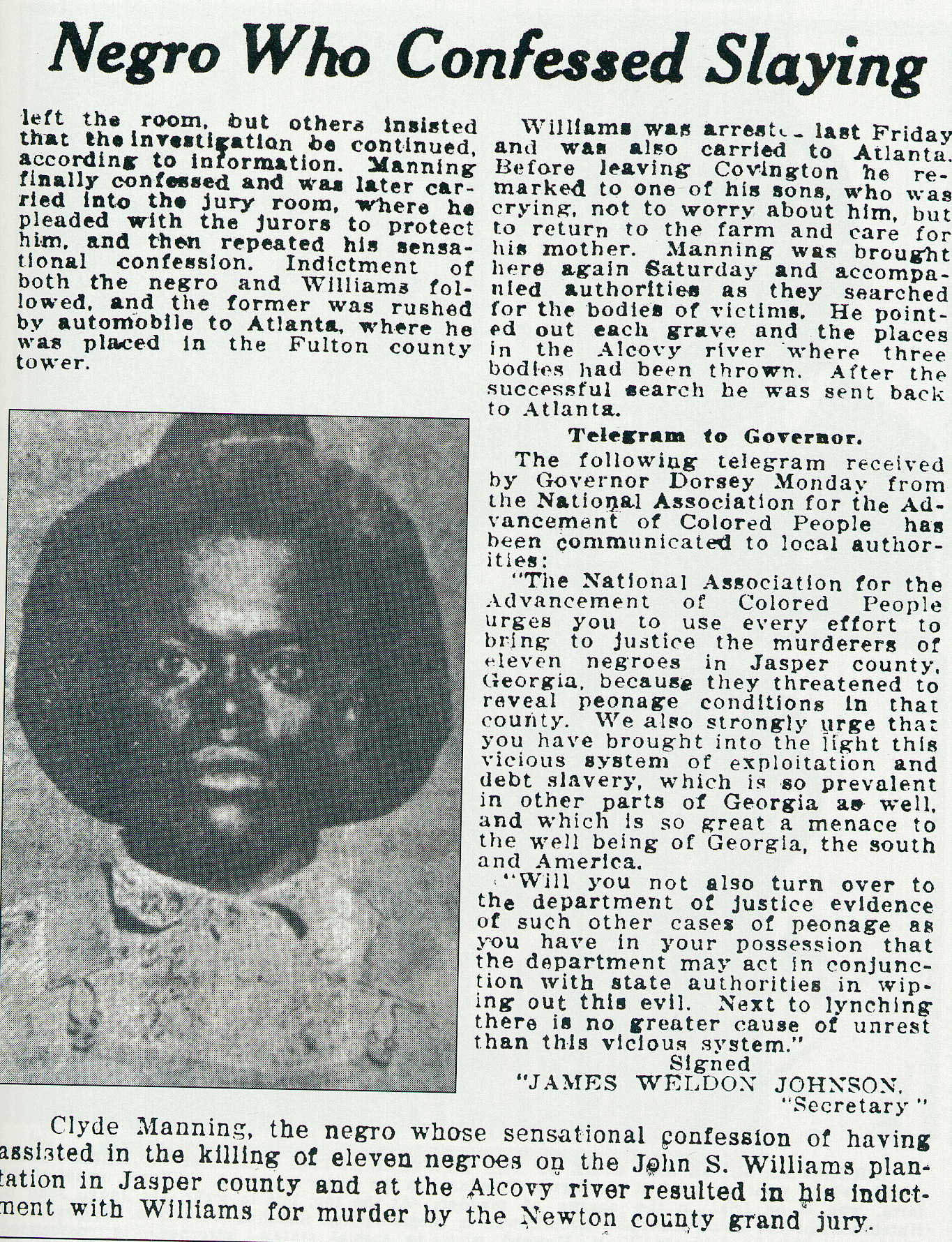 He decided to destroy the evidence, to kill 11 black men who could testify to the situation. Williams enlisted the aid of his farm boss, 27-year-old Clyde Manning, forcing him to methodically kill his friends. Men were chained together, two-by-two, weighted down with rocks, thrown over bridges, alive and terrified; others were bludgeoned with an axe, summarily shot, or ordered to dig their own graves.